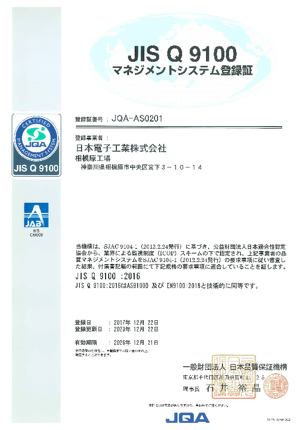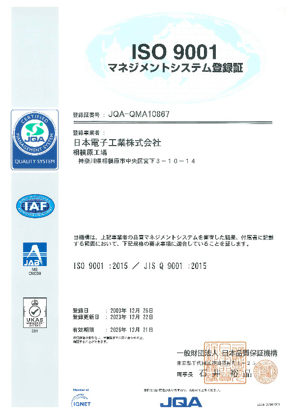 全ての工場でISO9001の認証を取得、相模原工場はISO14001およびJISQ9100も取得しております。