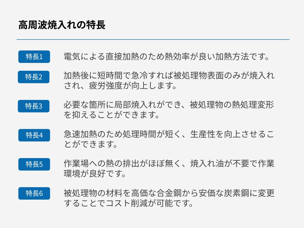 短時間で安定した加熱による高精度な表面焼入れを可能にします。受託加工部門での60年以上の豊富な経験と独自のノウハウに基づき、高周波設備の近代化や品質の向上、周辺機器などについての多種多様なご要望にお応えしています。