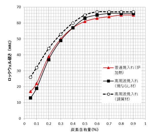 高周波焼入れによって得られる鉄鋼材料の最高表面硬さは、材料に含有している炭素の量によって異なります。
